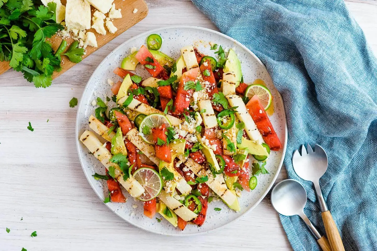 不管你怎么称呼这些西瓜,一旦烤熟,它们的焦糖味道就会呈现出一种新的口感。更不用说那些有趣的黑色条纹了。这个食谱为不太甜的西瓜沙拉带来了额外的口味。就连烤豆薯都显得烟熏熏的。加入芫荽叶和cotija奶酪你可以在一个地方找到一些夏天最新鲜的东西。