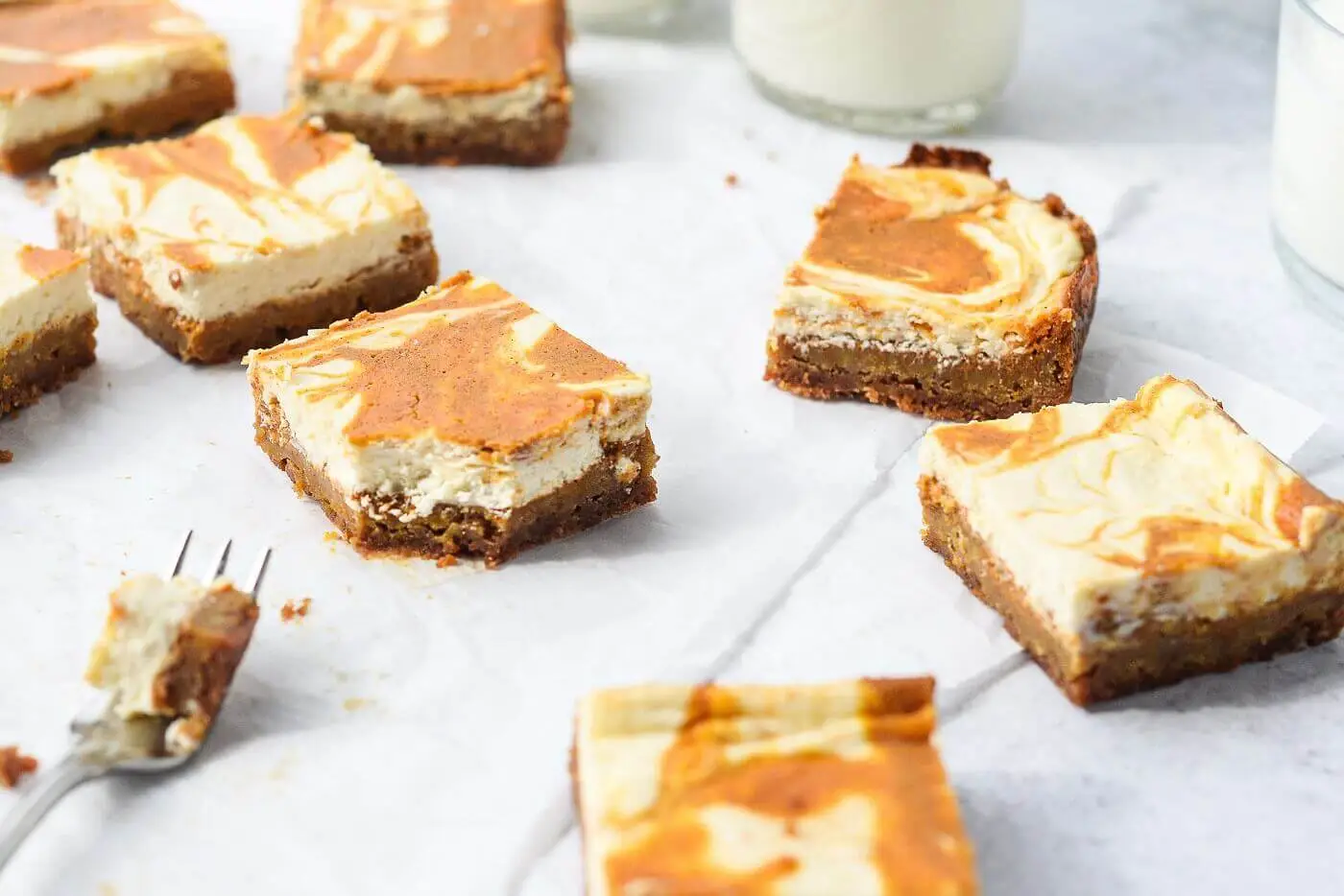 - 制作芝士蛋糕层:在一个中等大小的碗中,使用装有桨或搅拌附件的手持式或立式搅拌机,将奶油奶酪和希腊酸奶搅拌1分钟,以中等速度直至完全光滑和奶油。加入糖,鸡蛋和香草。高速打击直到完全合并。在南瓜面糊的顶部均匀铺开。